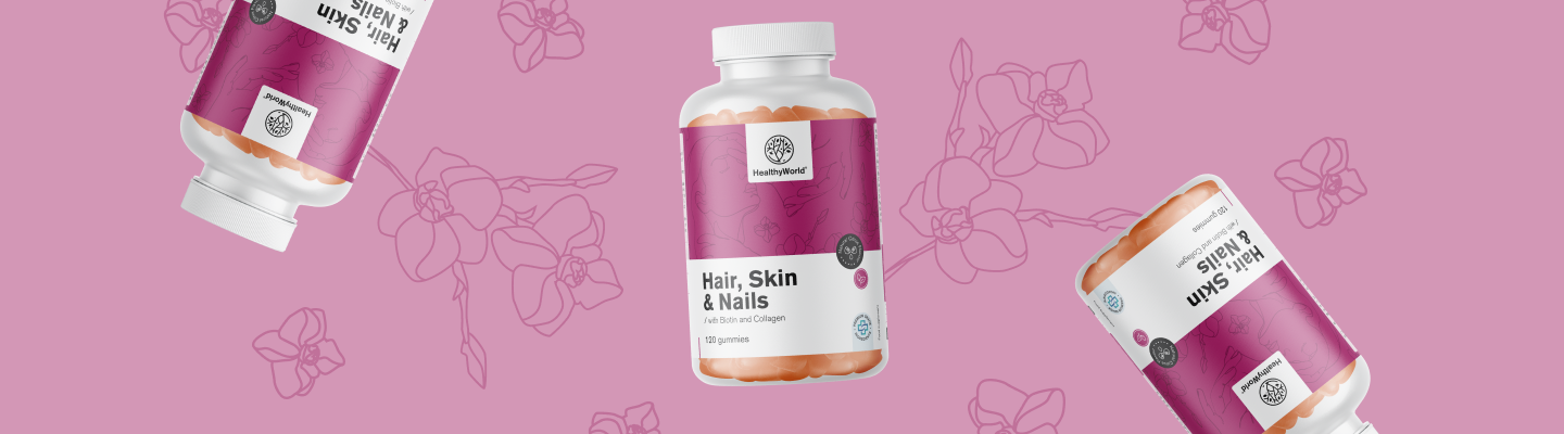 Las gominolas Hair, Skin & Nails son gominolas que contienen 3 vitaminas y colágeno, que cuidan de manera óptima el cabello, la piel y las uñas y al mismo tiempo: