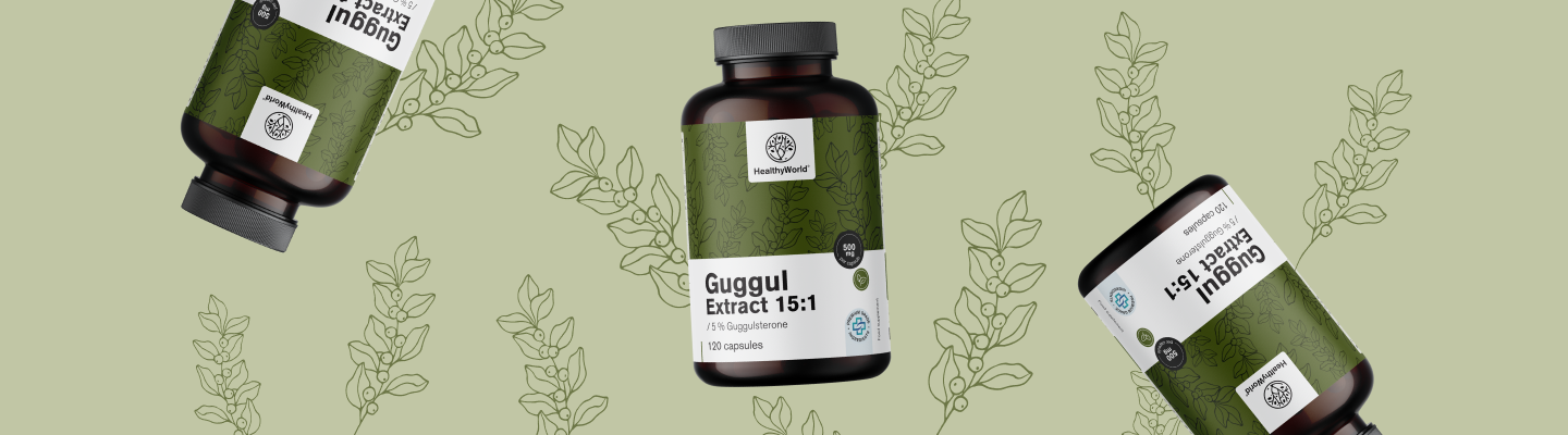 El guggul (Commiphora mukul) con alto contenido de guggulsterones tiene numerosas propiedades beneficiosas para el organismo humano, que han sido reconocidas en la ayurveda desde hace miles de años: